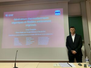 Soutenance de thèse de Loup Chopplet ActualitéSoutenances octobre 14, 2025 14:00 – 17:30 Loup Chopplet successfully defended his Phd thesis titled ” Générateurs thermoélectriques organiques et flexibles entièrement imprimés ” on October 14th 2025.